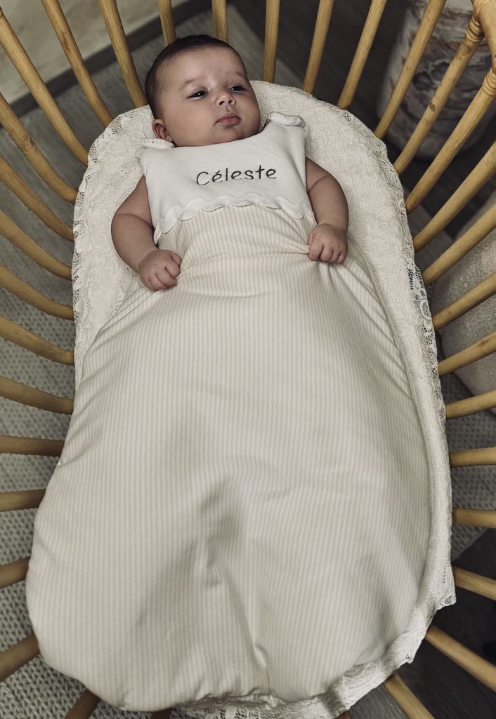 "Bonjour, j'aimerais à nouveau faire appel à vous (j'étais très ravie des articles que vous aviez confectionnés pour mon fils) pour réaliser une couverture, un nid d'ange et une attache tétine pour ma fille qui arrivera début Novembre."
