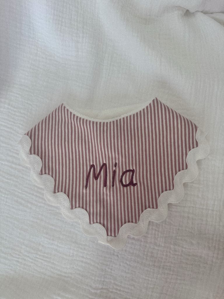 Personnalisation incluse : Le prénom de votre bébé est brodé au centre du bavoir, dans la typographie et la couleur présentées sur le modèle. Ces éléments ne sont pas modifiables afin de garantir un rendu harmonieux et soigné.