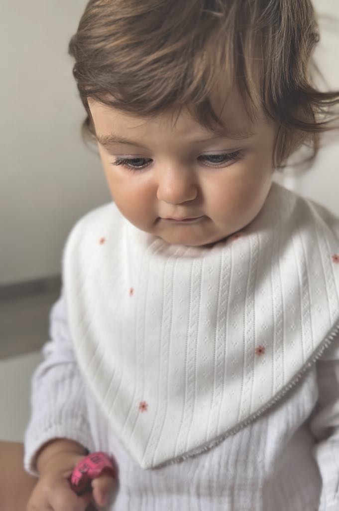 Ce bavoir bandana écru, orné de délicates petites fleurs, allie élégance, douceur et praticité. Un accessoire aussi raffiné qu’indispensable, idéal pour les bébés dès les premiers mois.