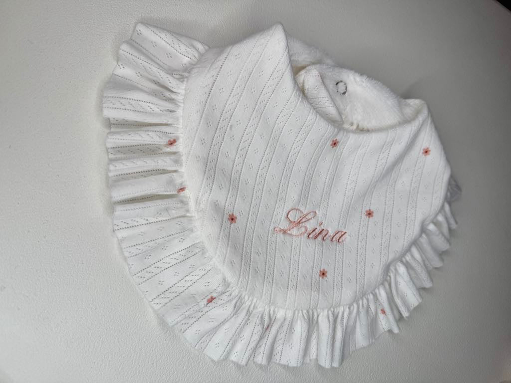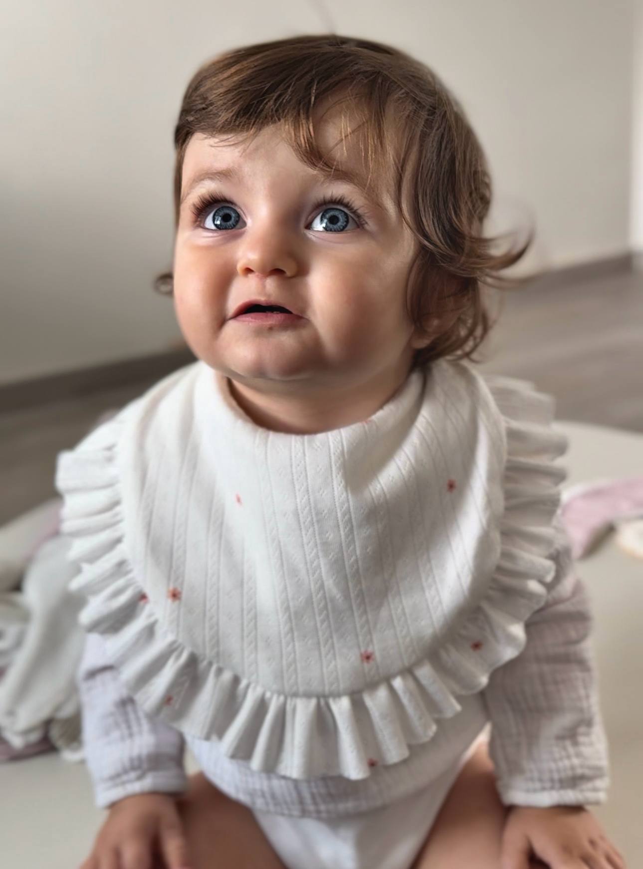 Un bavoir à la fois chic et pratique, pensé pour les bébés qui bavent avec élégance. Ce modèle rond, en tissu écru texturé et orné de petites fleurs roses, est sublimé par un volant plissé tout autour, pour une touche délicate et raffinée.