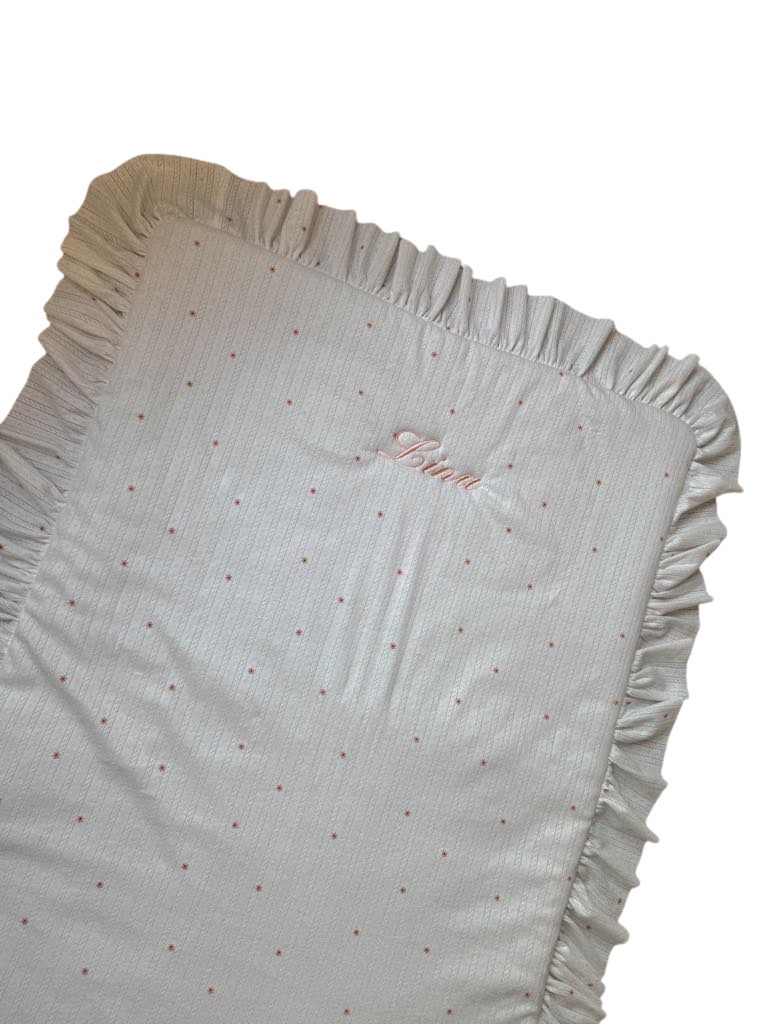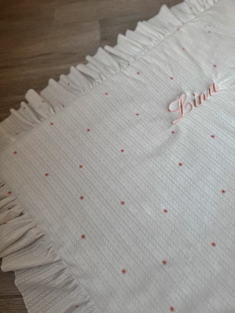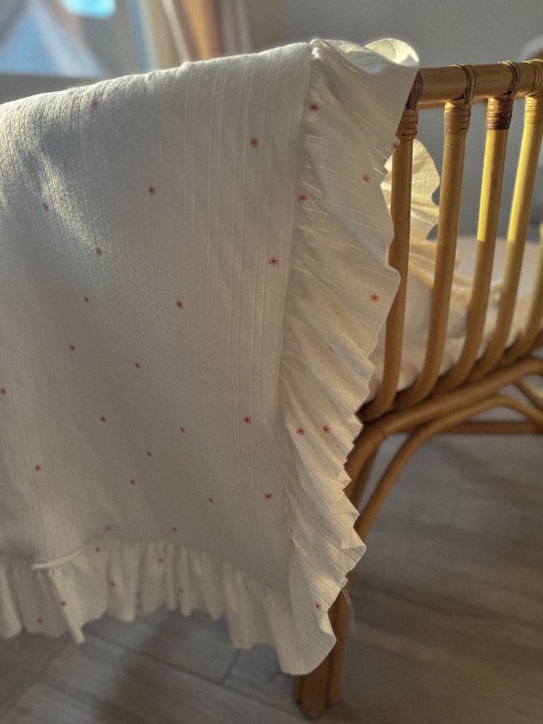 Douceur, élégance et charme intemporel : cette couverture à volant fleuri est une invitation à la tendresse. Confectionnée avec soin, elle se distingue par ses jolis petits motifs floraux et ses finitions à volants qui lui donnent une allure délicatement romantique.
